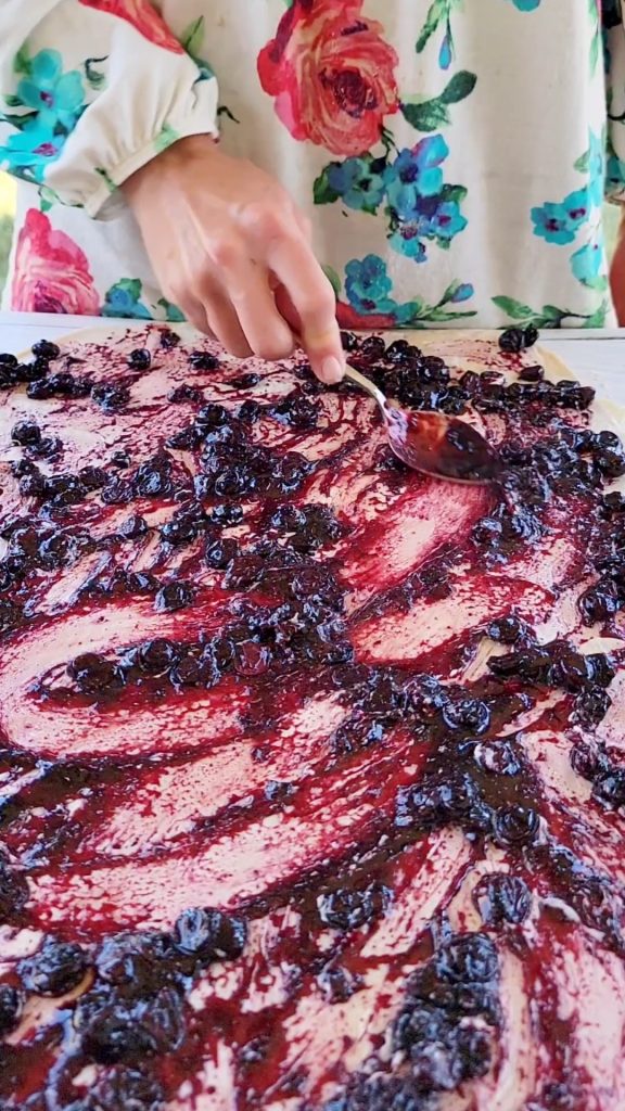 5. Roll dough on a lightly floured surface into a 12×18 inch rectangle. Spread 6 tablespoons softened butter over dough. Spoon blueberry jam mixture evenly over the entire rectangle.