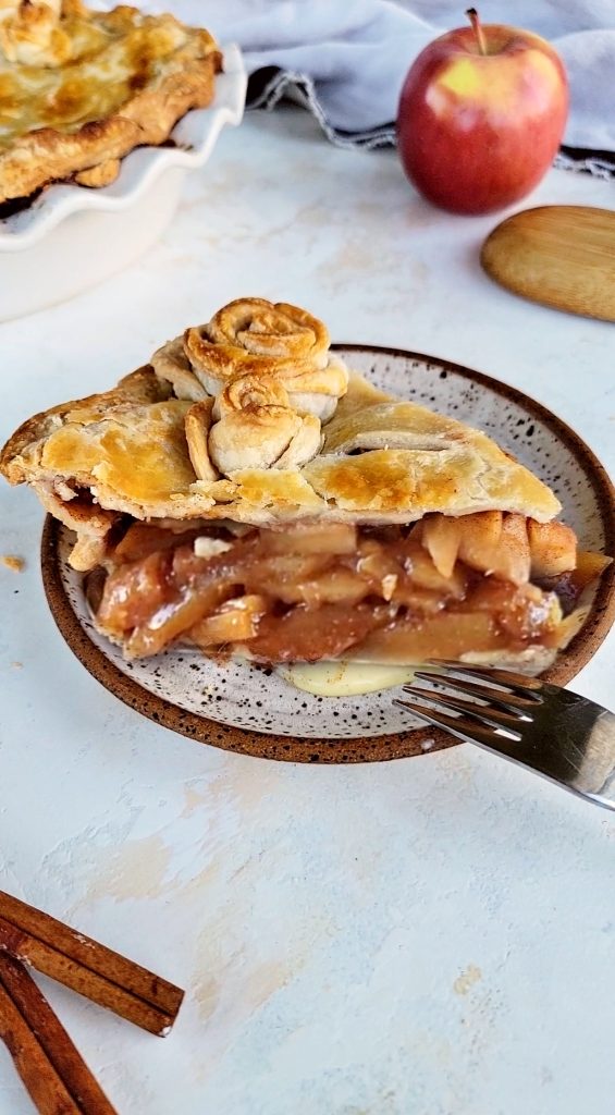 Like everything, I didn’t skimp on the apple pie filling in this apple pie recipe. It has a mountain of apples, so each slice is guaranteed to have plenty of apples, even after baking. The apples are coated in a sweet brown sugar cinnamon sauce that makes the filling irresistible.