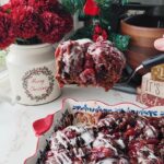 This Black Forest Focaccia combines a rich chocolate focaccia bread with a homemade cherry filling and drizzle of vanilla icing. The chocolate focaccia has the addition of semi-sweet chocolate to the dough, which creates pockets of melted chocolate in each bite. The cherry filling is made with Troegs Mad Elf Beer, which has notes of cherry, honey, and hints of cinnamon clove and allspice. These flavors add depth to the sweet cherry filling, but you can also make the filling with just water, if you prefer. The focaccia is finished with a drizzle of vanilla icing.