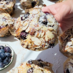 Allow the blueberry almond croissant muffins to cool a few minutes in the pan, then transfer to a wire cooling rack. Allowing them to cool a few minutes in the pan allows them to finish setting up so that when you grab them out of the pan, they don’t just crumble and fall apart.