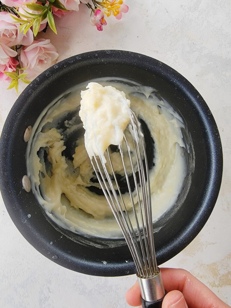 2. Make tangzhong. In a small saucepan, add bread flour and milk. Whisk constantly over medium heat until a paste forms. Remove from the heat and allow to cool for 10 minutes.