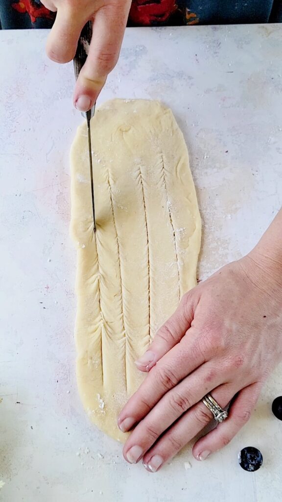 Once the dough is done rising, you’ll punch down the dough and turn out onto a floured surface. Divide the dough into 10 roughly equal pieces. Working with one piece at a time, and keeping the others covered with plastic wrap, roll into a 9×4 inch rectangle. Cut 4 slits in the center of the dough, making sure to NOT cut all the way through the ends. The slits are solely for the design in the roll. You can certainly skip this step if desired.