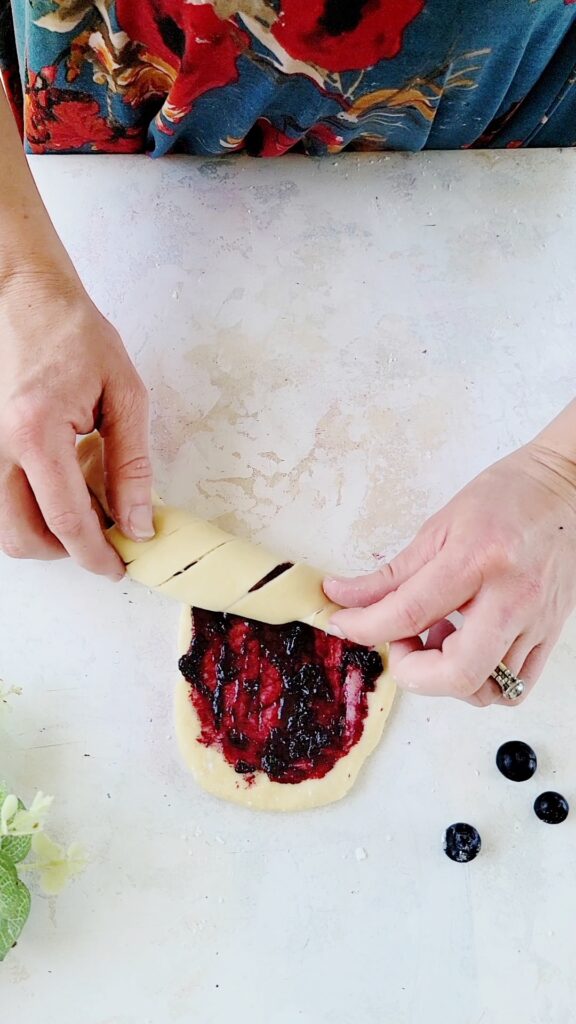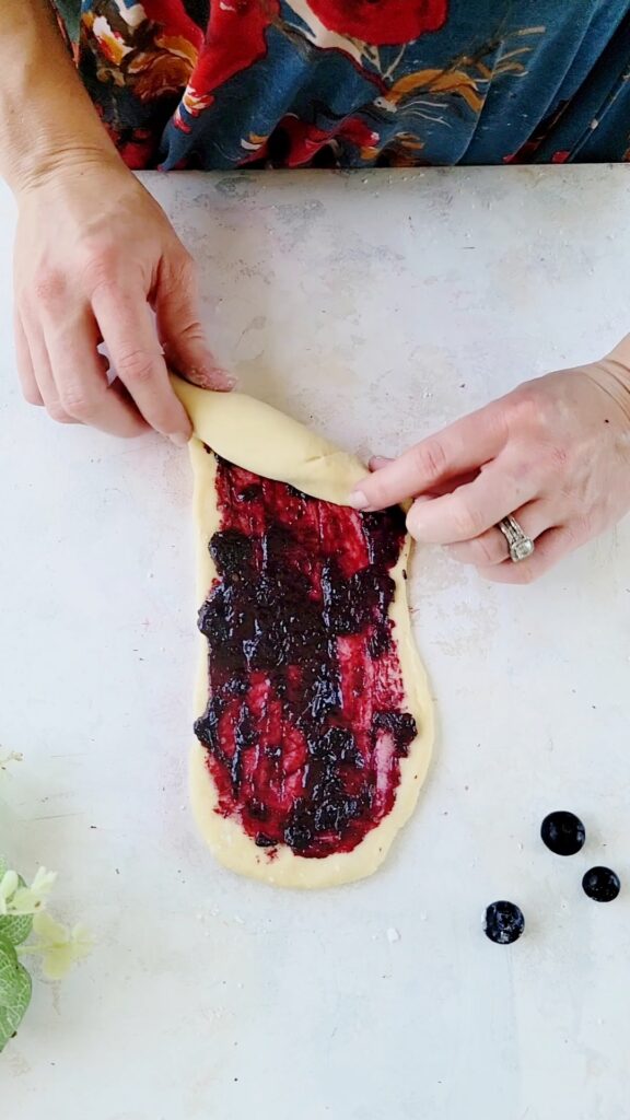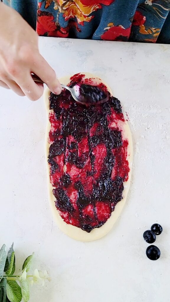 6. Divide and shape. Punch the dough down then transfer to a lightly floured surface. Divide the dough into 10 pieces. Working with one piece at a time, and covering the rest with plastic wrap, roll into a 9×4 inch rectangle. Cut 4 slits in the center of the dough, making sure to NOT cut through the ends. Spread a thin layer of the cooled blueberry jam over the rectangle. Roll the dough, starting at the short end, diagonally, into a log. Pinch the two ends together to seal. Place on a parchment paper lined baking sheet and repeat with the remaining dough.