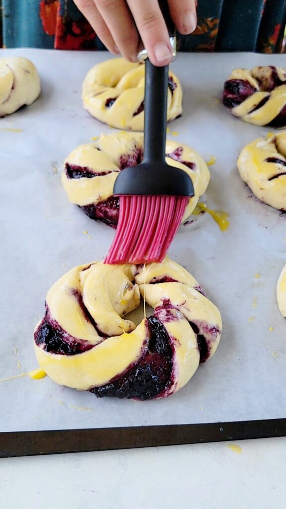 Brush the shaped rolls with a beaten egg. This gives the rolls a nice golden brown, shiny exterior.
