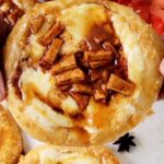 8. Gently press the center of the dough down. Flatten out the dough leaving a small border into a 4.5 inch circle. Place a scoop of cream cheese mixture in the center of the dough. Spread evenly across center. Top with apple mixture. Repeat with remaining dough. Brush the edges of the dough with a beaten egg, then sprinkle with brown sugar.