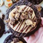 6. Scoop the filling into a zip-top bag. Snip the corner off of the bag, then pipe the filling into the center of the cookie. Drizzle with chocolate and top with Reese’s peanut butter cups. Enjoy!