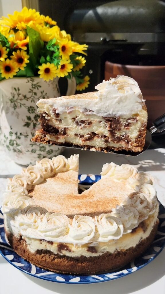 This Cinnamon Roll Cheesecake combines creamy, velvety smooth cheesecake with the warm flavors of a cinnamon roll. Rich, creamy cheesecake is layered with buttery, brown sugar cinnamon crumbles, then baked until set. The cheesecake is chilled, then topped with a homemade whipped cream and dusting of cinnamon sugar.