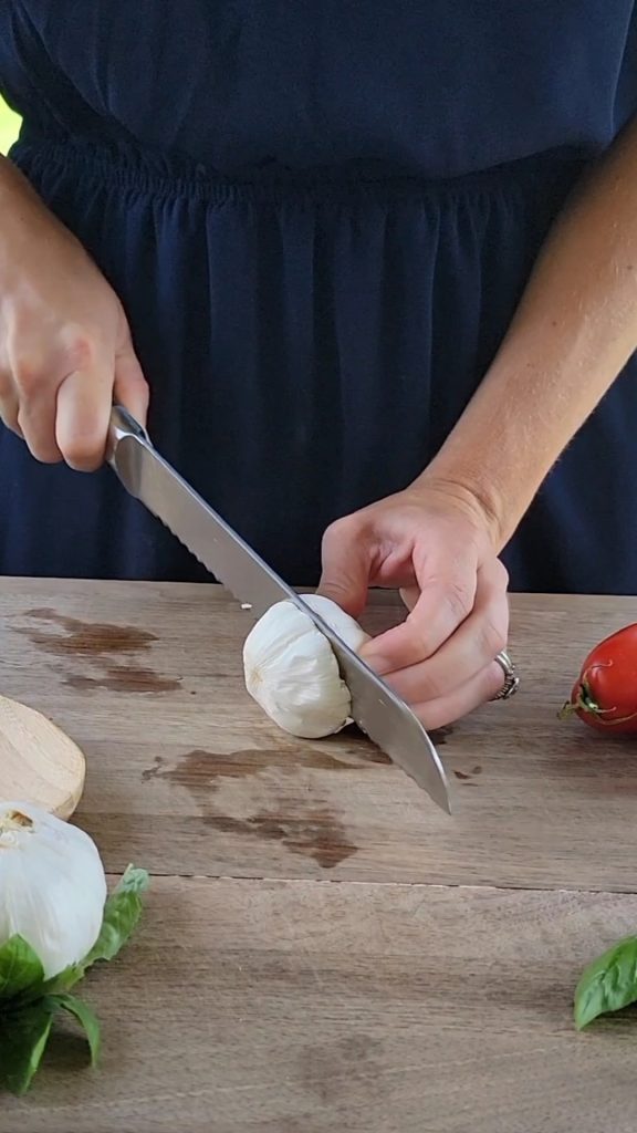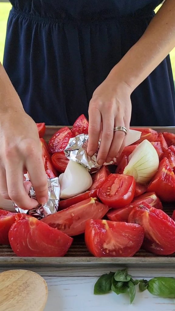 2. Cut out the core/stem of tomatoes, then cut tomatoes in half or in quarters, depending on how big they are. Cut the onions in quarters. Cut the garlic head in half (the outer paper shell should hold the garlic cloves together, but it’s okay if they fall apart). Place each garlic half in a square of aluminum foil, then drizzle with olive oil and season with salt and pepper. Loosely wrap up the garlic.