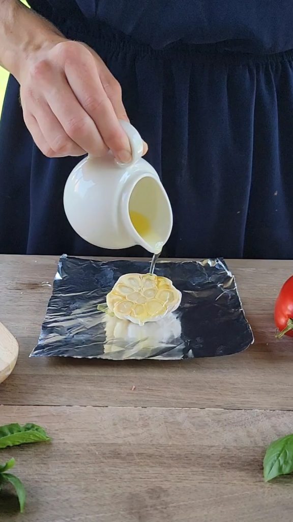 It is important to wrap the garlic heads in aluminum foil. This will prevent them from burning in the oven, and will allow them to roast perfectly, giving you that nice golden, soft roasted garlic clove. Trust me, the roasted garlic makes this sauce so good. When the garlic is roasted, it gets a slight sweet taste and the garlic itself is not as potent as raw garlic, hence why you can use much more in the sauce. To roast the garlic, you’ll want to cut the garlic head in half. It is okay if some of the garlic cloves fall out of the papery shell. Just put them in a square of aluminum foil. Place half of the garlic head in a square of aluminum foil. Drizzle with olive oil, then season with salt and pepper. Loosely wrap the garlic up. Repeat with remaining garlic.