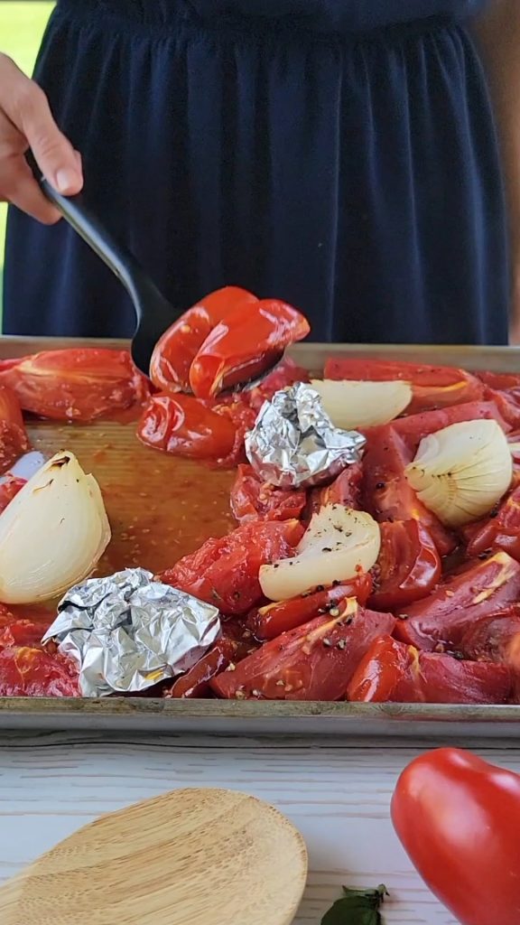 3. Add tomatoes, onions and garlic to a large baking sheet with sides (you will need more than one). Drizzle tomatoes and onions with olive oil, then season with salt and pepper. Bake in 400F oven for 30 minutes.