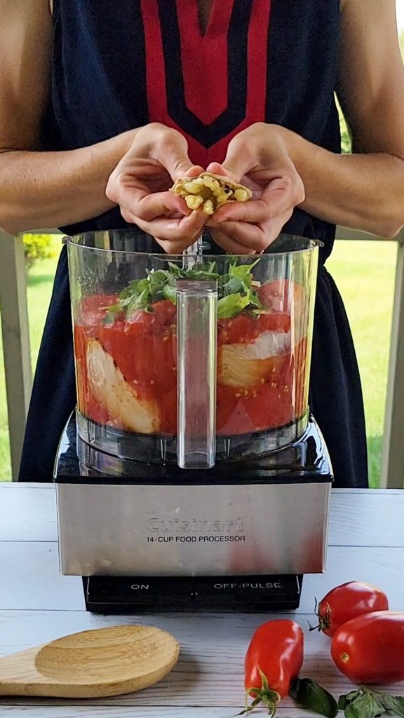 4. Remove the garlic from the aluminum foil and squeeze the roasted garlic cloves out into a blender. Use a slotted spoon to scoop tomatoes and onion into blender and blend to desired consistency. Add in fresh herbs and season with salt and pepper according to your taste preferences. Blend until combined. Taste the sauce to make sure it is to your liking. You can always add a touch more herbs or salt and pepper if desired.