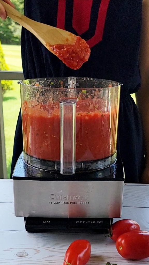 This sauce eliminates all of my worries. The majority of the moisture from the tomatoes cooks off in the oven after 30 minutes. Then the entire tomato is blended – shell, seeds and all, into a smooth, thick sauce. I, personally, don’t feel there is a need to remove the shells or the seeds, as it all gets blended together. Sure you can see a few of the seeds, but they are hardly noticeable, and they don’t affect the taste. If canning still intimidates you, you can certainly freeze this sauce instead.