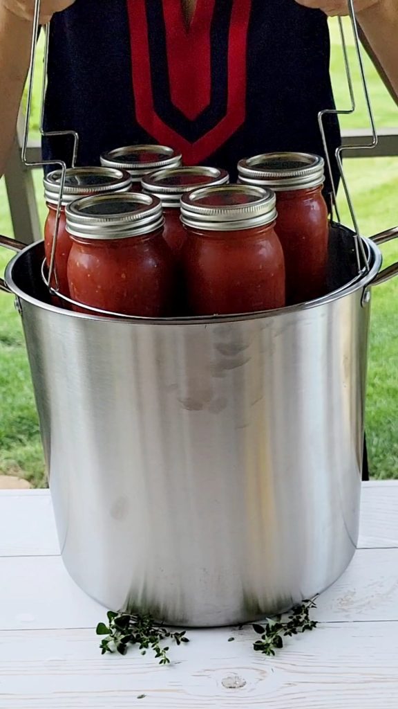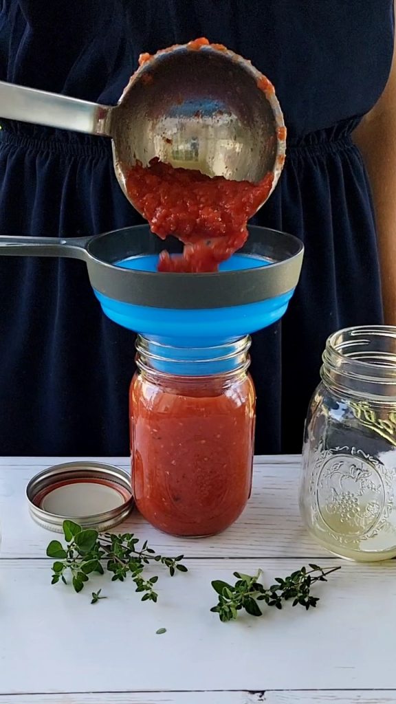 If you are canning, you need to add 1 tablespoon lemon juice for a pint jar. This helps with the preservation of the tomato sauce. It lowers the pH of the tomato sauce enough to allow for safe water bath canning. You may add a teaspoon of sugar at this step too, if desired, to offset the acidity of the lemon juice.