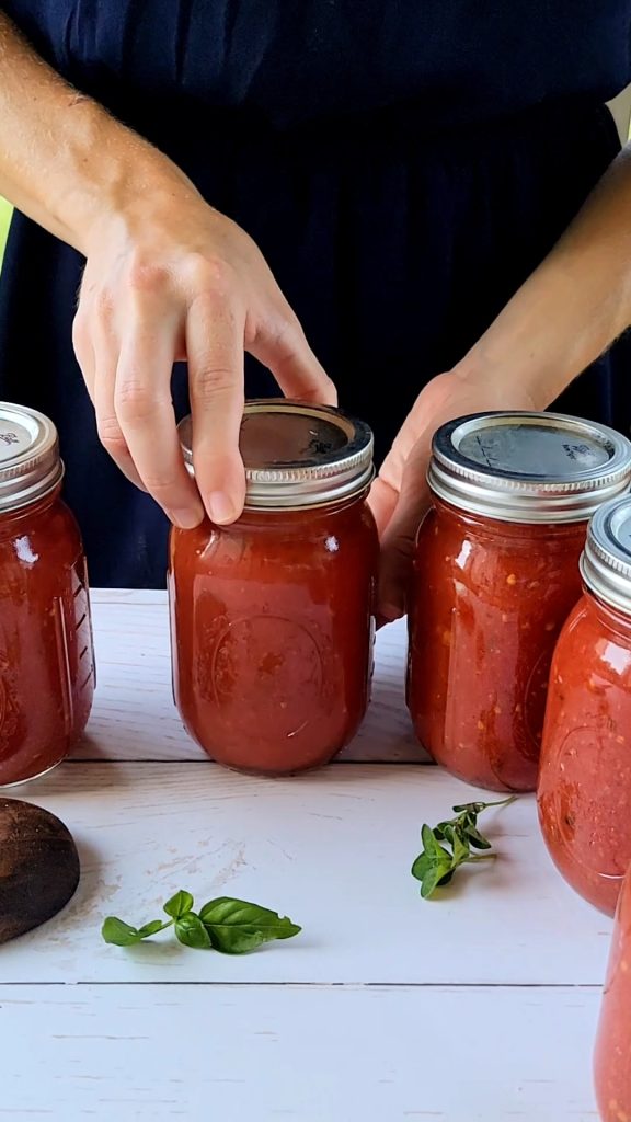 Make sure the jars are sealed by pressing on the center of the lid. If the lid center pops back up, reprocess jars within 24 hours, or store in refrigerator and use within 1-2 days. Store jars in a cool, dark place. I like to use my sauce within a year of canning it, but as long as the seal remains intact and the lid is not bulging, you can store these for up to 18 months.