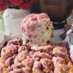 This Funfetti Focaccia is loaded with rainbow sprinkles, stuffed with a raspberry cheesecake filling, and drizzled with a raspberry icing. The focaccia is very easy to make and requires no kneading. You can make it using yeast in just a few hours, or use sourdough. This focaccia is crisp and golden on the outside and incredibly fluffy and tender on the inside.