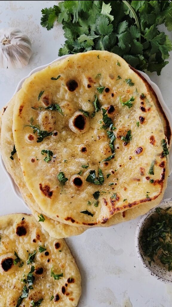 This Naan is super soft, bubbly and fluffy. It’s ready to serve warm in under an hour. The garlic butter spread on top makes these irresistible.