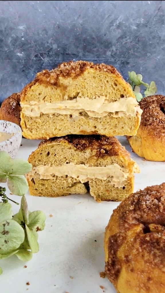 Now it’s time to bake. Bake in preheated oven for 20 minutes, or until golden brown. Once the bagels are ready to serve, you can mix together the pumpkin maple cream cheese spread. Spread over bagels, serve and enjoy!