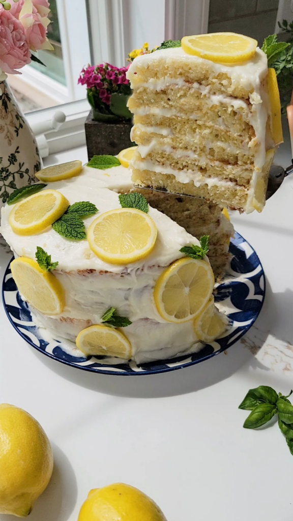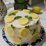 9. Assemble. Cut each cake layer in half, horizontally to yield 6 layers. Or, you can leave them as is and make a 3-layer cake. Place your bottom layer on your serving plate, then spread frosting over top. Place the second cake layer on top, then spread with frosting. Continue to do so until all layers have been used. Spread frosting over the top and sides of the cake. To decorate, add lemon slices all over the top and sides of cake, then add mint leaves to the lemon slices.