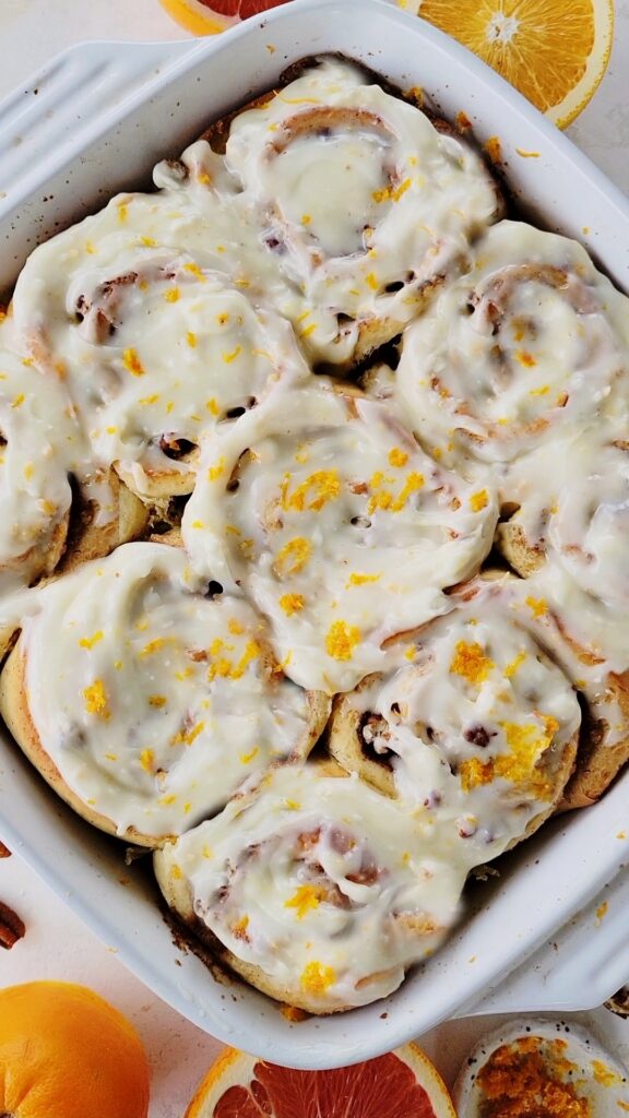 These Orange Cinnamon Rolls are made with a super soft, fluffy dough that’s flavored with fresh orange juice and orange zest. It’s generously filled with a buttery, melt in your mouth brown sugar cinnamon pecan filling, then topped with a smooth and creamy orange cream cheese icing. If you’re crunched for time, don’t worry, these rolls can be made in roughly an hour.