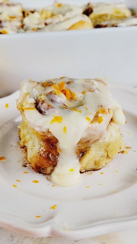 However, when it comes to the different seasons, I like to play around with flavors and bring in some of the seasonal produce. Enter these orange pecan cinnamon rolls. These cinnamon rolls rank right up there with some of my favorites I’ve created. The fresh orange juice and orange zest that is speckled throughout the dough, combined with the buttery brown sugar pecan filling and orange cream cheese is just melt in your mouth delicious!