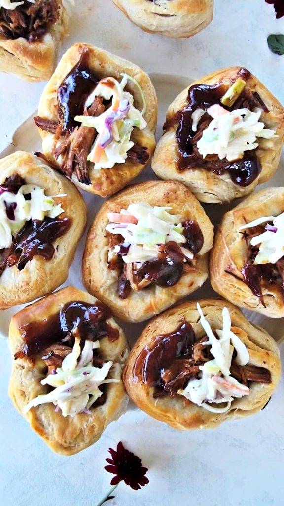 These Pulled Pork (or chicken) Taco Cups are a fun, easy meal. Buttery, flaky biscuits are baked with cheese and pulled pork until golden brown. The pulled pork is cooked in a flavorful, homemade sauce in the slow cooker or instant pot. The taco cups are topped with a sweet and tangy apple slaw and barbecue sauce, making a tasty dinner, lunch or appetizer.