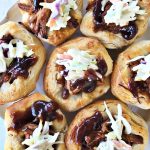 These Pulled Pork (or chicken) Taco Cups are a fun, easy meal. Buttery, flaky biscuits are baked with cheese and pulled pork until golden brown. The pulled pork is cooked in a flavorful, homemade sauce in the slow cooker or instant pot. The taco cups are topped with a sweet and tangy apple slaw and barbecue sauce, making a tasty dinner, lunch or appetizer.
