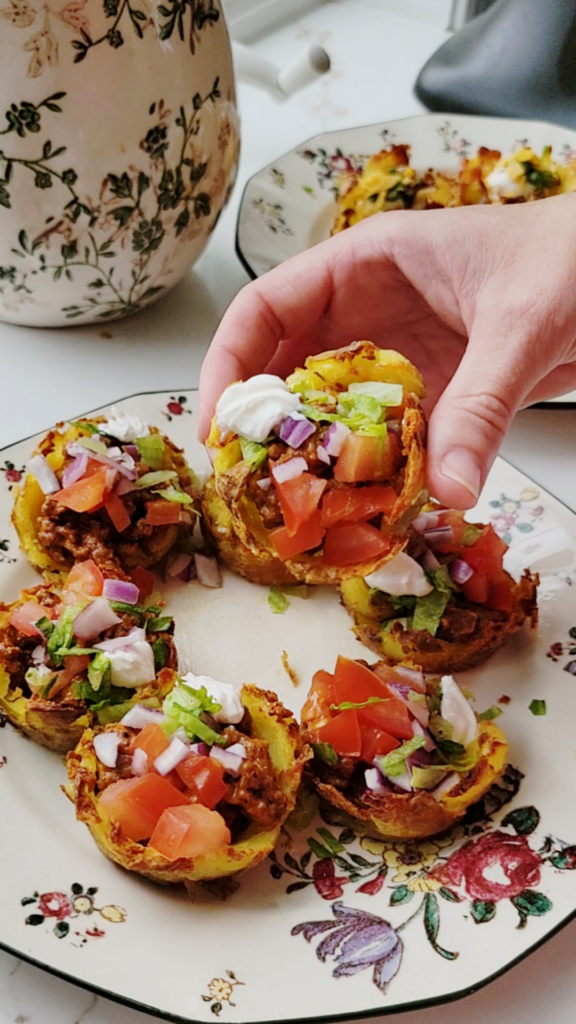 Remember those taco cups I made a couple years ago? They always seem to be a huge hit whenever I share them on my social media channels, and I can see why! They are easy, tasty and fully customizable. Well, I decided to put a spin on those taco cups and instead of using a tortilla shell, I used a baby potato. The potato gets golden and crispy after baking and oh my word! It’s good. I actually, dare I say, think I like these better than the original taco cups. Although, both are delicious.