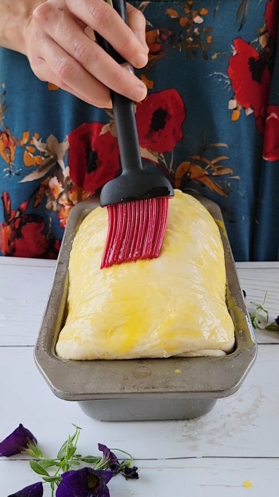 3. Punch down dough and place on lightly floured surface. Roll into an 8×15 inch rectangle (it doesn’t have to be exact), then starting at the short end, roll into a cylinder. Place in lightly greased 9×5 inch loaf pan. Cover with a kitchen towel or plastic wrap and allow to rise for 30 minutes, or until the top of the bread is 1 inch above the top of the pan.