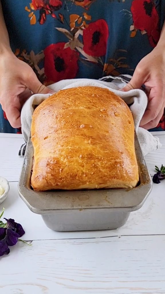 The last thing you need to do is bake the bread for 25-30 minutes, or until the bread is golden brown. Make sure you allow the bread to cool for a few minutes before slicing into it (so that you don’t burn yourself).