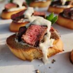 7. Assemble. When ready to serve, spoon parmesan cream sauce over top of toasted baguette slices. Add 2 thin slices of steak on top of the sauce. Add another small spoonful of parmesan cream sauce over top of the steak. Garnish with a fresh parsley leaf. Serve and enjoy!
